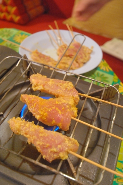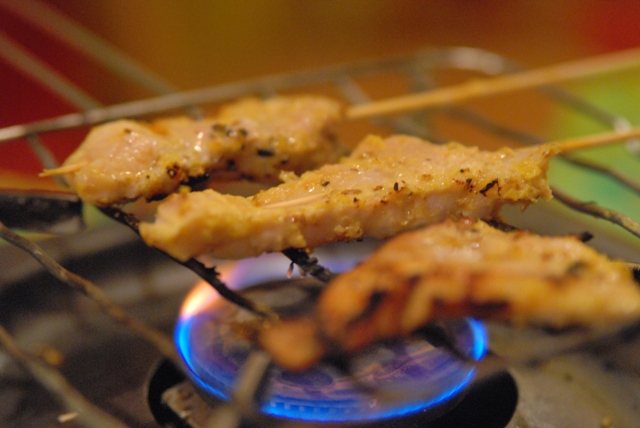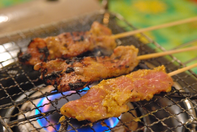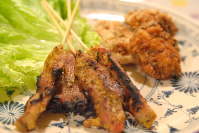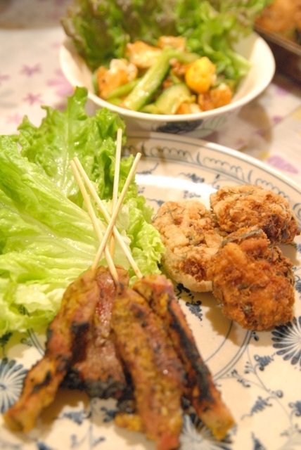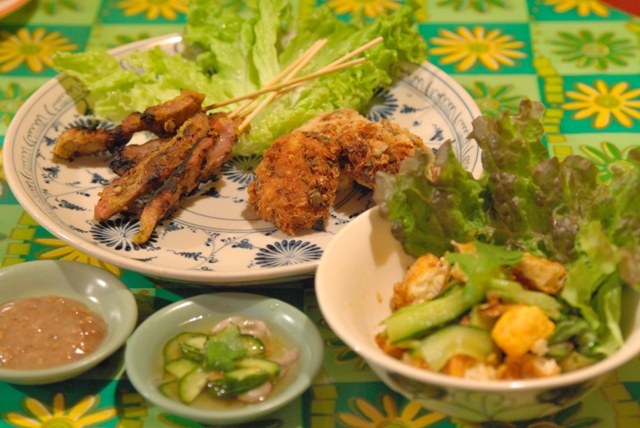 | ・豚の串焼き(ムーサテ) ・タイ式さつま揚げ(トートマンプラー) ・目玉焼きのサラダ(ヤムカイダーオ) |