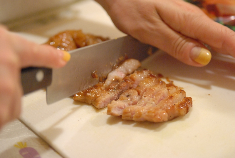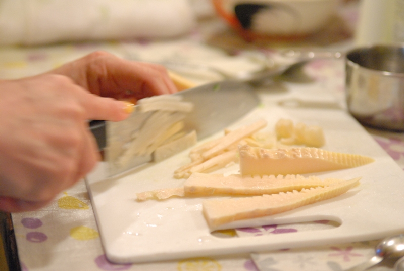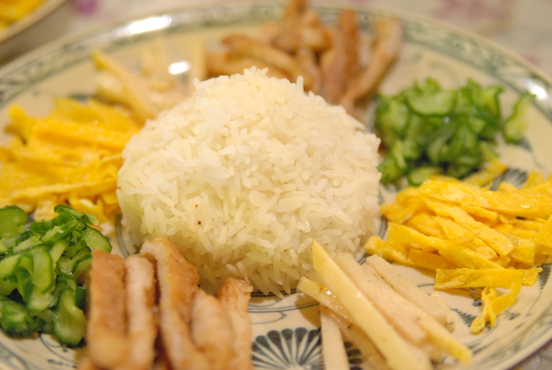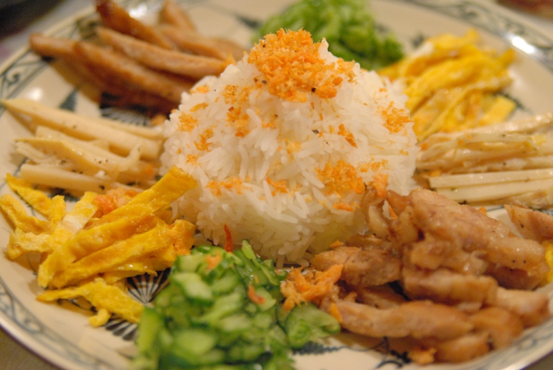 ごはんのまわりに、筍やら豚肉やら、おかずを載せて甘酸っぱ
